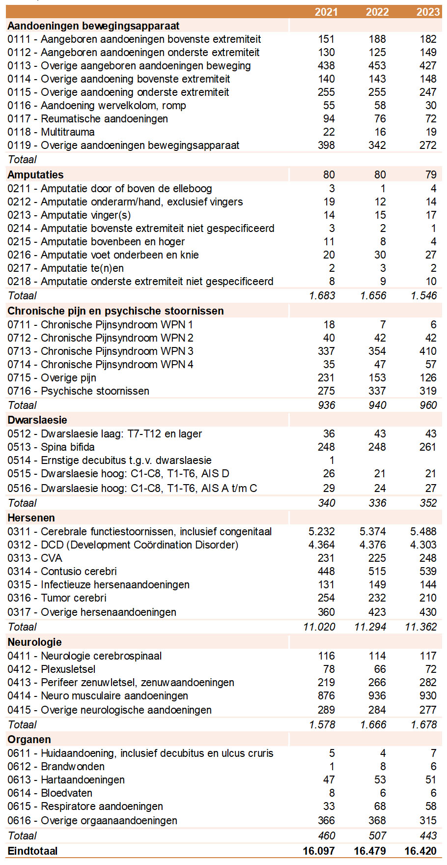Tabel 9. Meest voorkomende aandoeningen bij poliklinisch behandelde kinderen 0 t/m 17 jaar per jaar in 2021-2023 (Bron: Performation – Revalidatieregister)