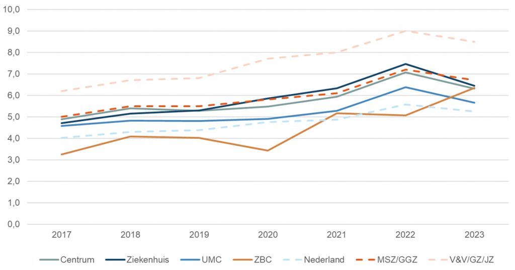 Het ziekteverzuim in de zorg ligt hoger dan het Nederlandse gemiddelde voor alle bedrijfstakken (bron: CBS – Ziekteverzuim). Binnen het cluster zorg is het verzuim in de universitaire, algemene en categorale ziekenhuizen (inclusief de MSR-instellingen) laag. Als we verder inzoomen op de MSR-instellingen zien we per type instelling dat de trend vergelijkbaar is met deze landelijke trend (bron: DigiMV). De UMC’s laten gemiddeld structureel een wat lager ziekteverzuim zien, terwijl de gemiddelde verzuimpercentages van de ZBC’s een veel grilliger verloop tonen. De gemiddelde verzuimpercentages van ziekenhuizen en revalidatiecentra zijn iets hoger en vergelijkbaar met de andere percentages in het cluster medisch specialistische zorg.