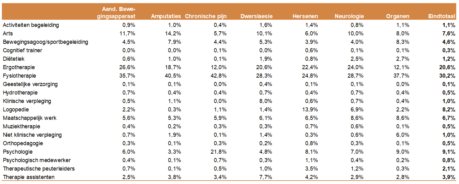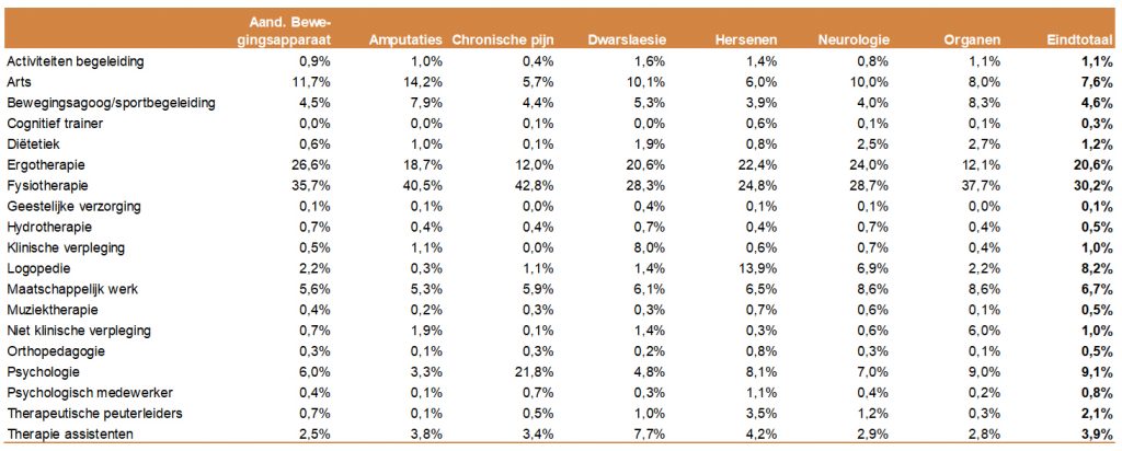 - Gemiddeld is de behandelinzet het hoogst vanuit de fysiotherapeut, ergotherapeut, psycholoog, logopedist, revalidatiearts en de maatschappelijk werker.