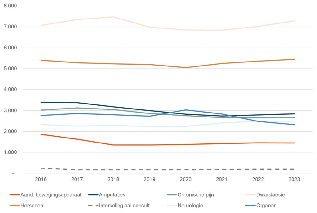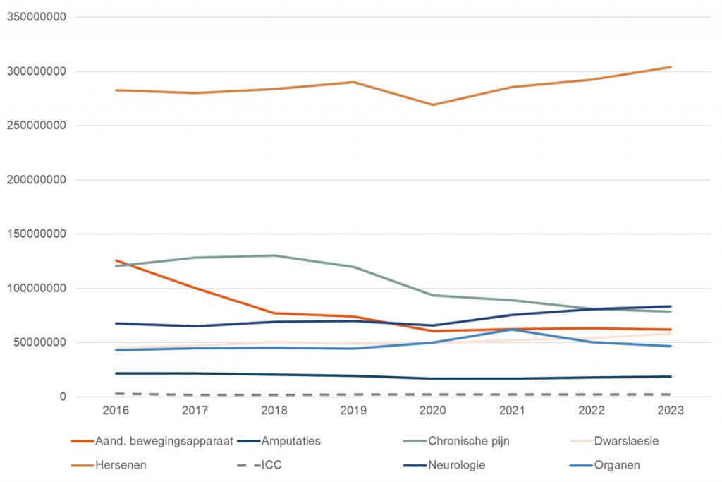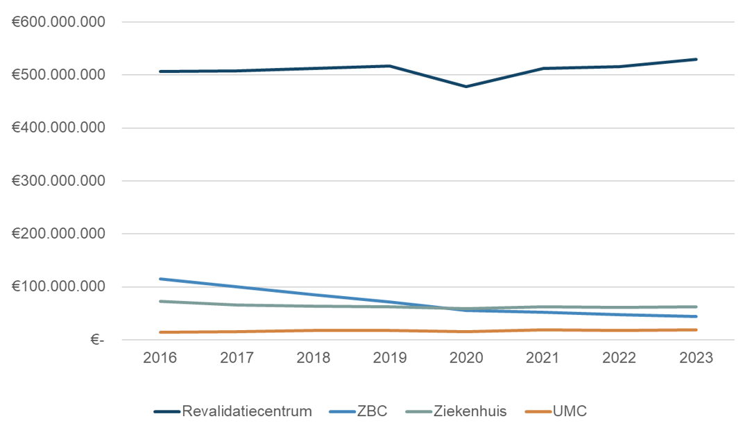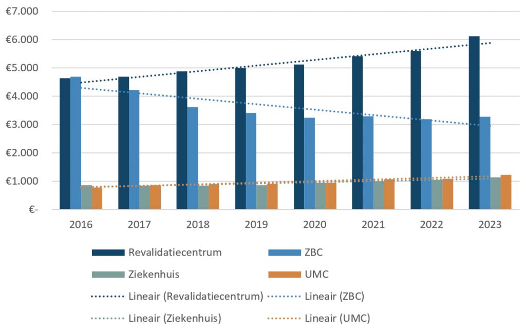 Van de zorgkosten in 2023 werd 81% gemaakt door de revalidatiecentra (categorale ziekenhuizen), 12% werd toegeschreven aan algemene, topklinische of academische ziekenhuizen en 7% aan ZBC’s. Deze verhoudingen zijn redelijk stabiel. Het aandeel van de ZBC’s nam in 2023 iets af, terwijl dat van de revalidatiecentra licht steeg.