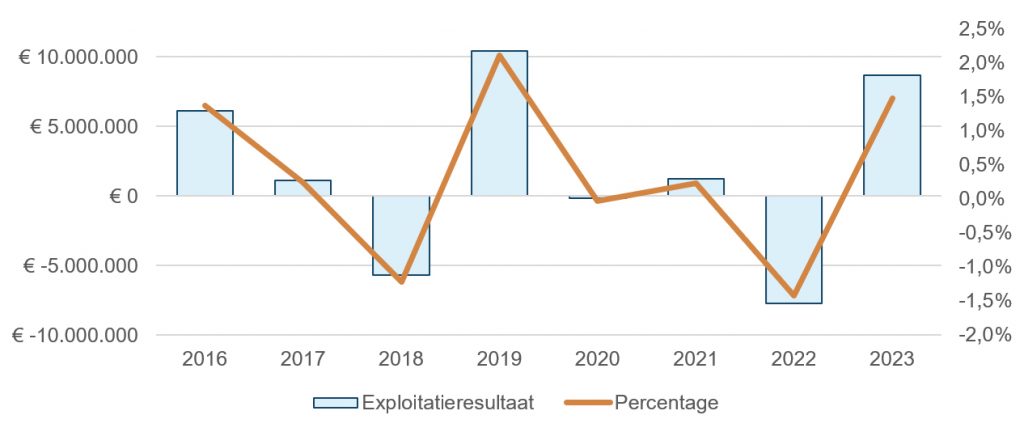 Het totale resultaat van de revalidatie-instellingen laat de afgelopen jaren een grillig verloop zien. Voor een gezonde bedrijfsvoering waarbij aanbieders niet interen op het eigen vermogen, maar kunnen investeren in bijvoorbeeld vastgoed of EPD, is het belangrijk om een minimaal rendement van 2% te halen. Na een grote terugval in het exploitatieresultaat tijdens de coronajaren en een flink negatief resultaat in 2022, lijkt de situatie zich in 2023 weer wat te herstellen. Deze trend zal in 2024 naar verwachting doorzetten.