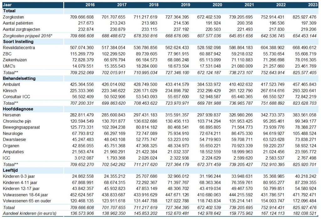Tabel 1. Totale zorgkosten medisch specialistische revalidatie in Nederland 2016-2023 (Bron: Vektis)