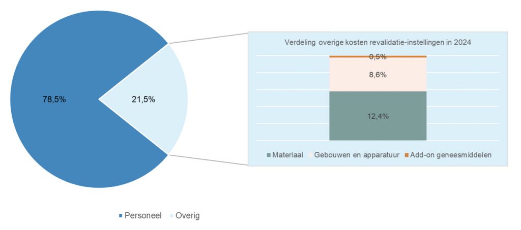 Nadat 2022 financieel een zwaar jaar was voor de revalidatie-instellingen, was er in 2023 sprake van herstel. Met ongeveer hetzelfde aantal patiënten was er sprake van hogere omzet. Deze stijging kwam met name voor rekening van de revalidatiecentra en de ziekenhuizen. Dit heeft vooral te maken met tariefeffecten: met de herijking van de NZa werden tarieven weer in lijn gebracht met de werkelijke kosten. De herijking heeft zoveel impact, omdat de personeelskosten in de MSR een groter deel van de zorgkosten uitmaken dan bij andere specialismen (figuur 5). Omdat deze personeelskosten vaker aan de inflatie worden aangepast, lopen de tarieven na enkele jaren achter op de kosten. De herijking door de NZa corrigeert dit.
