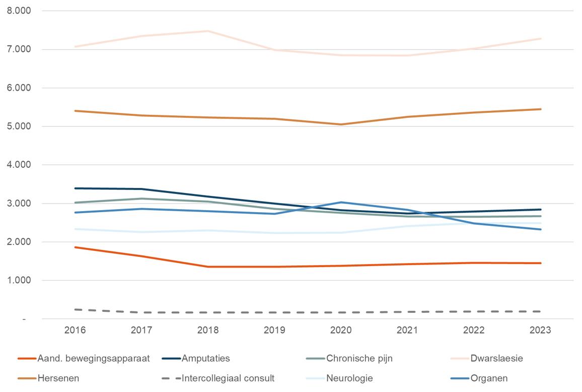 Van de zorgkosten in 2023 werd 81% gemaakt door de revalidatiecentra (categorale ziekenhuizen), 12% werd toegeschreven aan algemene, topklinische of academische ziekenhuizen en 7% aan ZBC’s. Deze verhoudingen zijn redelijk stabiel. Het aandeel van de ZBC’s nam in 2023 iets af, terwijl dat van de revalidatiecentra licht steeg.
