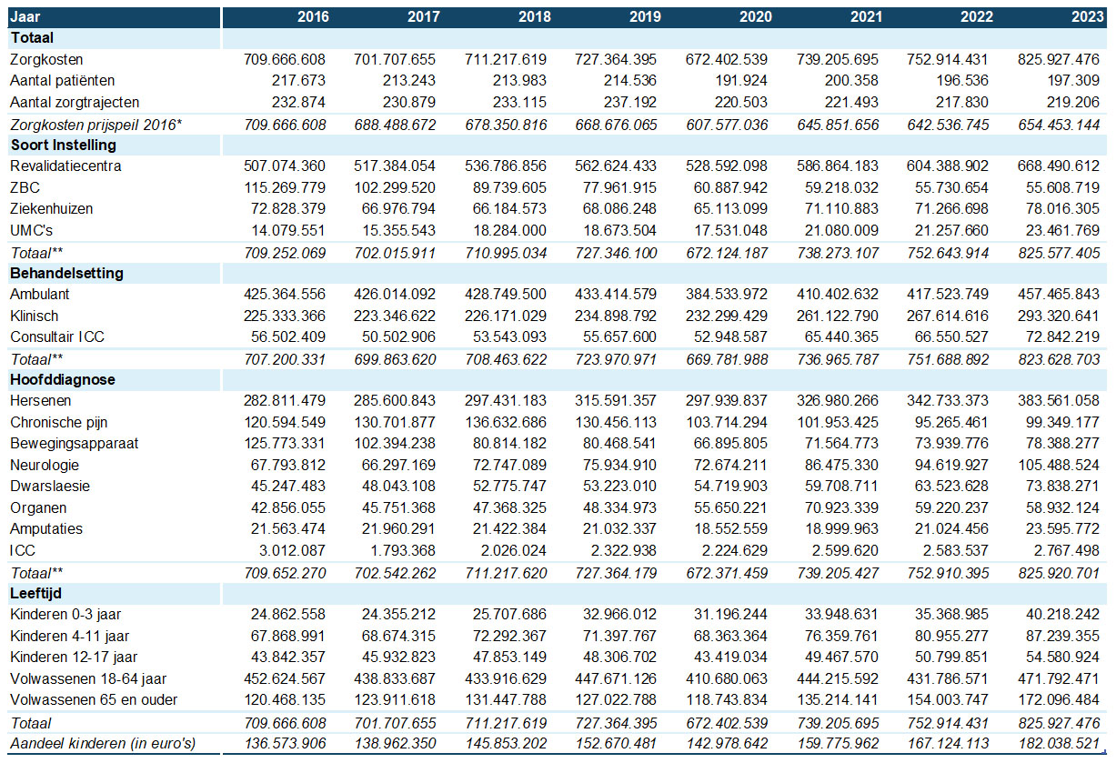 Tabel 1. Totale zorgkosten medisch specialistische revalidatie in Nederland 2016-2023 (Bron: Vektis)