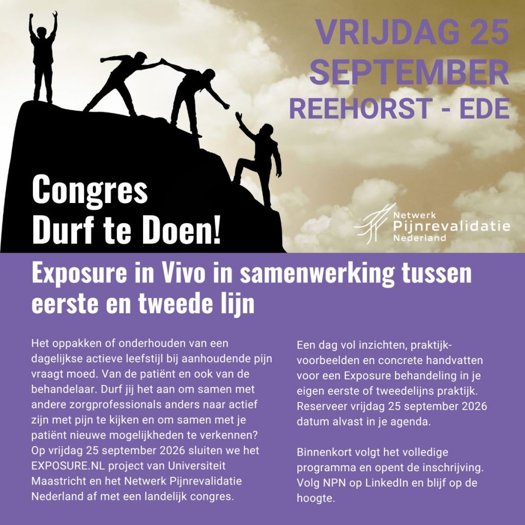 Op vrijdag 25 september 2026 wordt het EXPOSURE.NL project van Universiteit Maastricht en het Netwerk Pijnrevalidatie Nederland afgesloten met een landelijk congres. Een dag vol inzichten, praktijkvoorbeelden en concrete handvatten voor een Exposure behandeling in de eerste- of tweedelijns praktijk.
