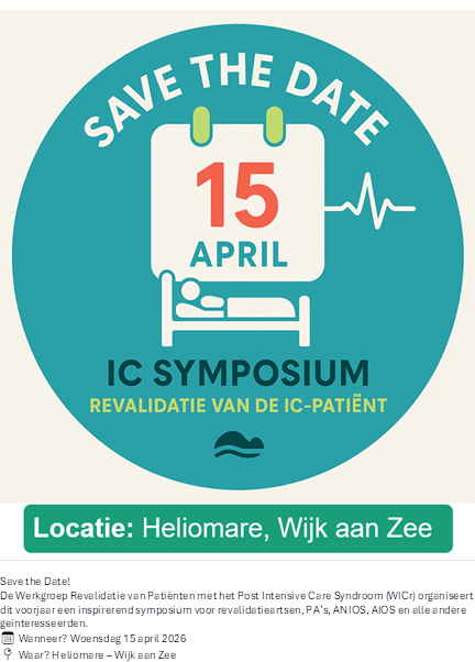 Save the date De VRA Werkgroep Revalidatie van patiënten met het post Intensive Care Syndroom (WICr) organiseert op 15 april...