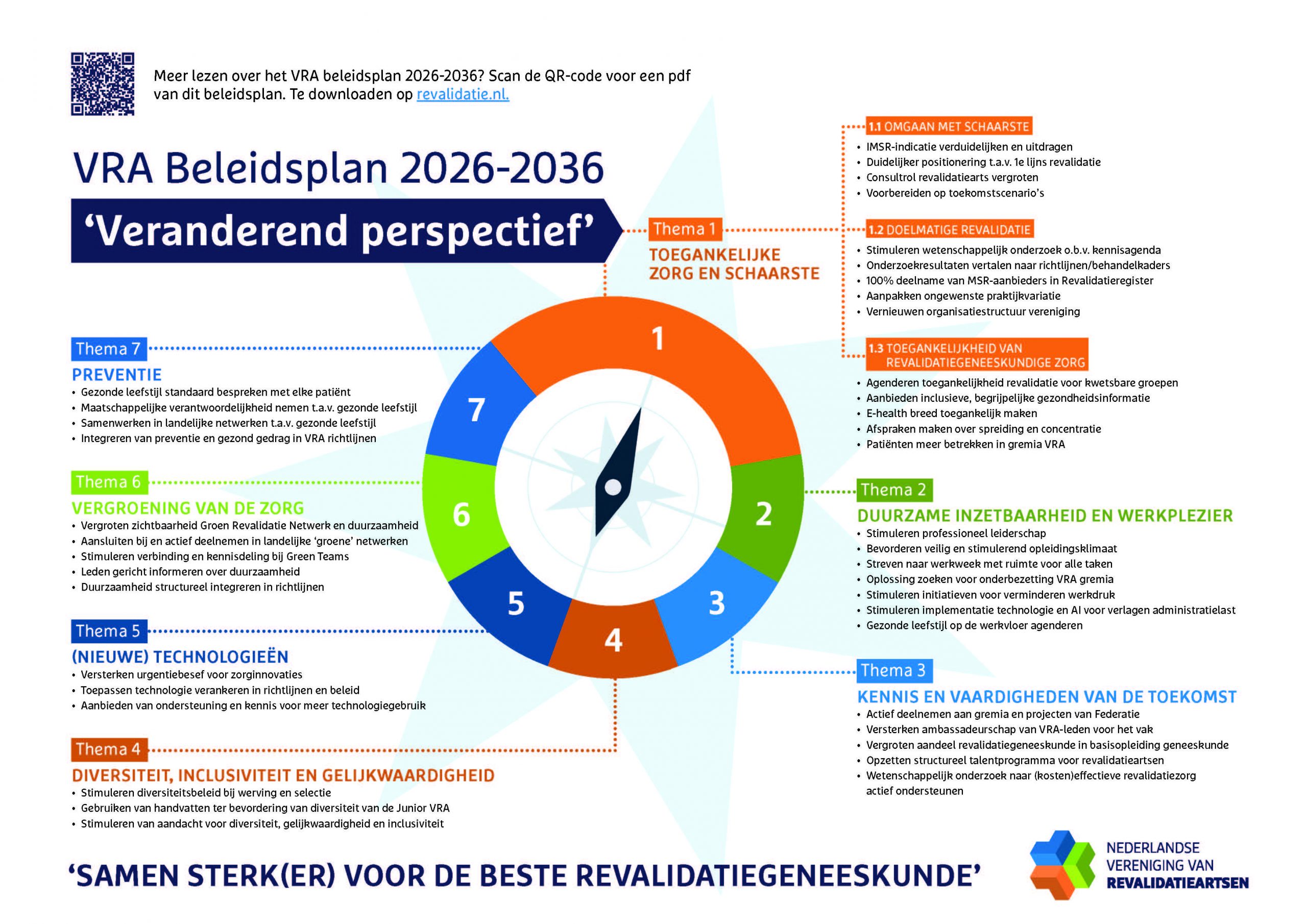 In het VRA beleidsplan 2026-2036 volgt de VRA de thema’s van de ‘Toekomstvisie Medisch Specialist 2035’ van de Federatie Medisch Specialisten. De thema’s zijn daarin specifiek uitgewerkt voor onze wetenschappelijke vereniging en de revalidatiegeneeskunde.