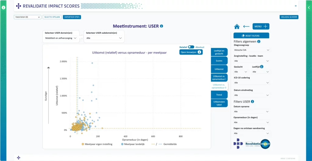 Afgelopen week heeft het dashboard uitkomsten van Stichting Revalidatie Impact nieuwe berekeningen en figuren gepubliceerd. Dankzij deze nieuwe release zijn de uitkomsten nu ook als relatieve scores te bekijken. Eerder liet het dashboard, bijvoorbeeld voor een klinische CVA-patiënt, een verschilscore van 18 punten op de USER tussen opname en ontslag zien. Het nieuwe dashboard laat ook zien dat dit een relatieve verbetering van 42% is op het gebied van zelfredzaamheid. Op deze manier wordt duidelijker welke metingen onder de uitkomstgegevens zitten en hoe we dit bekijken binnen de revalidatie.