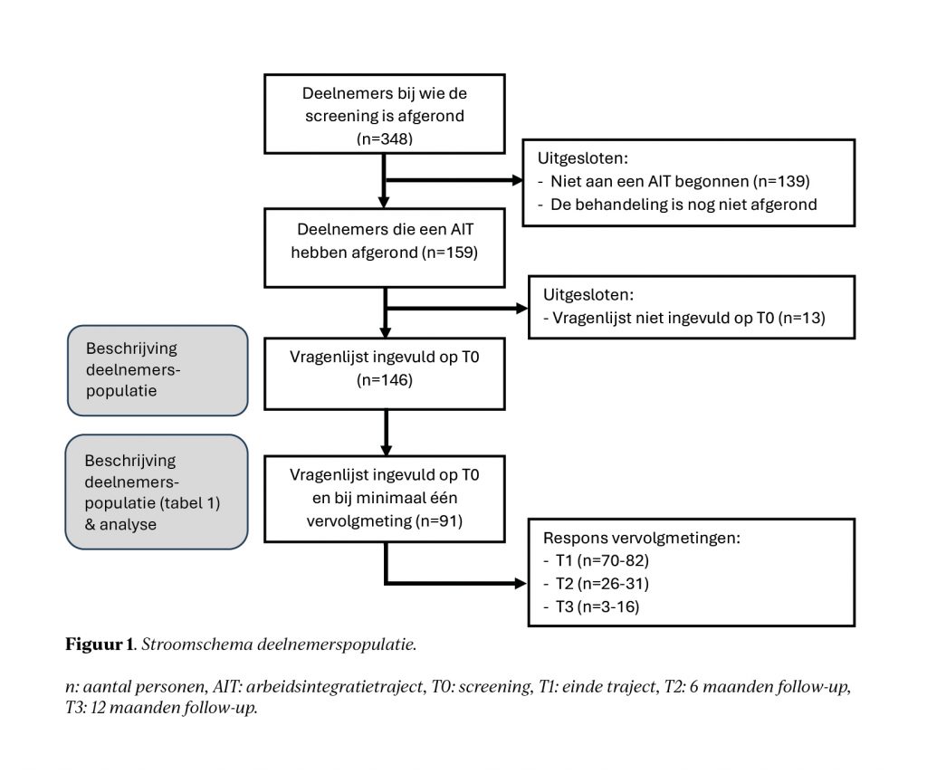 Deelnemers waren 18 tot 67 jaar oud, werkend voor ontstaan van klachten en aangemeld vanwege werkbeperkingen. Inclusiecriteria: deelname en afronding AIT wegens post-COVID, betaald werk en beheersing Nederlandse taal. Exclusiecriteria: onvoldoende functionele capaciteit, ontbreken van stepped care, psychische problemen die specifieke behandeling vereisten en ontbrekende screening. Alle deelnemers gaven schriftelijke toestemming.