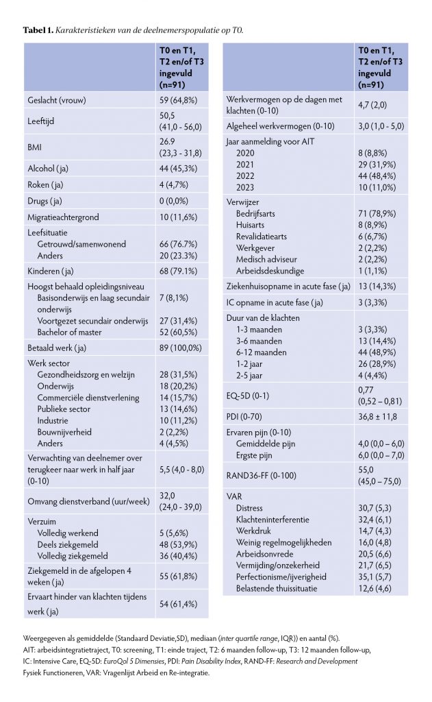 De kernset vragenlijsten arbeidsintegratie van Reneman et al.10 werd gebruikt. Deze set wordt ook gebruikt binnen het ‘Vroege Interventie’-netwerk. Focus lag op kwaliteit van leven, pijn, fysiek functioneren en terugkeer naar werk. Metingen vonden plaats bij screening (T0), afronding AIT (T1), zes maanden follow-up (T2) en twaalf maanden follow-up (T3). Meetinstrumenten staan in onderaan dit artikel gepubliceerde appendix tabel A.