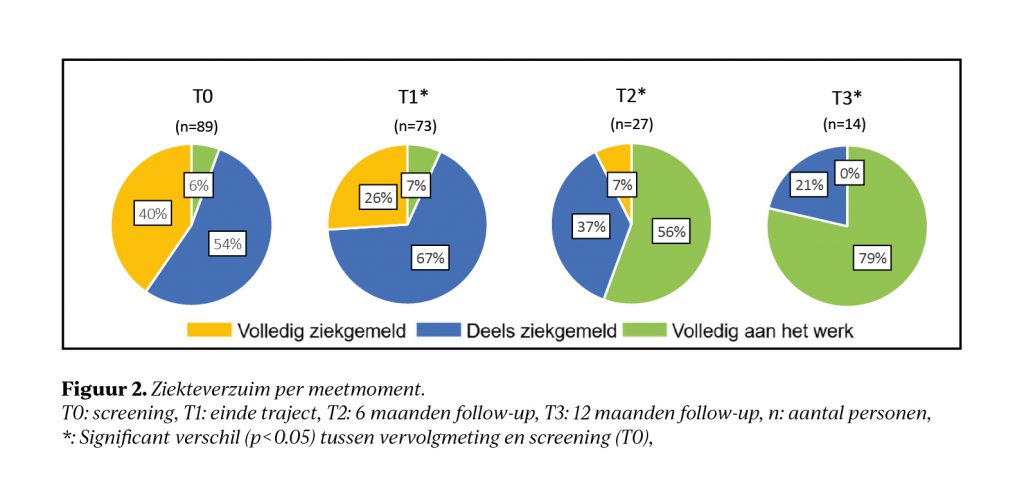 Figuur 2 toont het ziekteverzuim op de verschillende meetmomenten. Bij screening was 40% van de deelnemers volledig ziekgemeld. Dit daalde significant tot 26% na afronding van het AIT (p=0,033), 7% bij zes maanden follow-up (p=0,001) en 0% bij twaalf maanden follow-up (p=0,004). Het percentage volledig werkenden steeg van 6% bij screening tot 56% bij zes maanden (p=0,001) en 79% bij twaalf maanden follow-up (p=0.004). Het percentage gewerkte uren ten opzichte van het dienstverband veranderde significant over de tijd, waarbij het gemiddelde toenam van 46,3 (14,4)% bij screening naar 85,3 (26,0)% bij twaalf maanden follow-up (F(3, 16,6)=89,2, p<0.001) (tabel 2). Paarvergelijking toonde dat deze stijging niet optrad bij afronding AIT maar pas intrad vanaf zes maanden follow-up en bleef bestaan bij twaalf maanden follow-up.