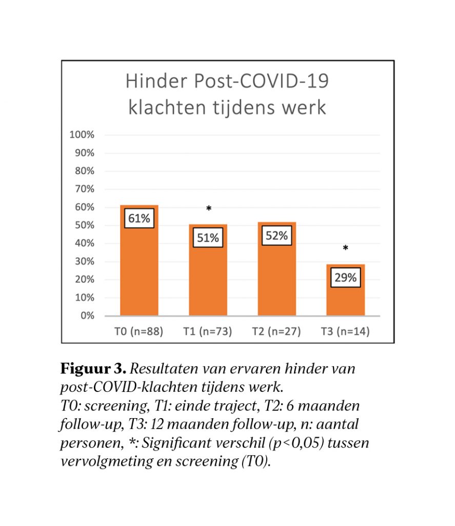 Wat betreft werkgerelateerde uitkomsten verbeterde zowel het werkvermogen als het aantal werkenden op alle vervolgmetingen ten opzichte van de screening. Het percentage gewerkte uren nam echter pas significant toe bij zes maanden en twaalf maanden follow-up, mogelijk omdat de behandeling zelf tijdelijk extra belasting veroorzaakte. Ook rapporteerden minder deelnemers post-COVID-symptomen tijdens het werk bij afronding AIT en na twaalf maanden follow-up. Omdat alleen de deelnemers die klachten ervoeren tijdens werk de vraag over werkvermogen tijdens werk dienden in te vullen is het responspercentage op deze vraag laag en deze resultaten dienen met voorzichtigheid te worden geïnterpreteerd.