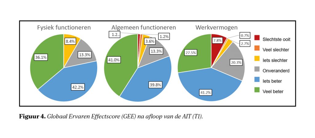 Van de 83 deelnemers die de GEE-vragenlijst invulden na afronding AIT (figuur 4) rapporteerde meer dan driekwart een ervaren verbetering in fysiek en algeheel functioneren en meer dan de helft een verbetering in werkvermogen ten opzichte van voor de training.