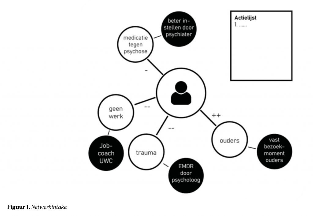 In het UMC Utrecht ontwikkelden we de netwerkintake, een herstelondersteunende probleemanalyse waarmee we niet alleen de problemen maar ook de krachtbronnen in iemands verhaal uittekenen en hoe die factoren (relaties, gebeurtenissen, ervaringen) met elkaar samenhangen.6 Vanuit de tekening formuleer je een aantal persoonlijke doelen. Vervolgens bepaal je met drie vragen hoe je die doelen wilt bereiken. Eerst: wat kun je zelf doen? Daarna: wat kunnen je naasten betekenen? En pas als laatste: wat kan ik als professional daaraan toevoegen?Deze volgorde is belangrijk omdat een beweging die ontstaat vanuit een intrinsieke motivatie, versterkt door krachten uit de leefwereld, veel duurzamer is dan een beweging die van buitenaf door professionals wordt opgelegd. De uitkomstmaat is een 5-punts doelrealisatiescore, waarbij 1 staat voor volledig behaald en 5 voor sterke achteruitgang. Bij een score van 3, 4 of 5 is het zaak te bespreken of de doelen onrealistisch waren of de interventies niet passend.
