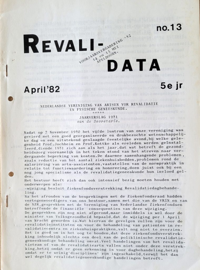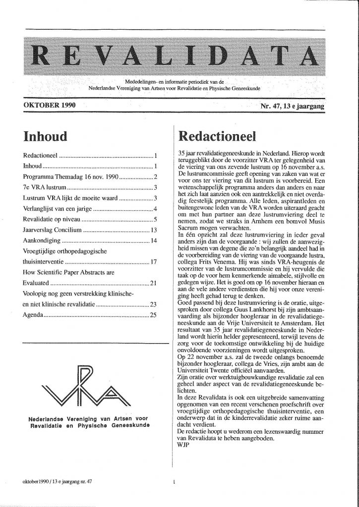In 2001 nam ik de hoofdredactie van Revalidata van Hans Jongbloed over. Hij en Wim Peek hadden Revalidata inmiddels ontwikkeld tot een waardig periodiek met een prima performance. In die tijd bestond Revalidata ongeveer voor de helft uit inhoudelijke artikelen naast het verenigingsnieuws. Bij mijn aantreden stelde ik dan ook dat Revalidata een mix moest bevatten van informatie en verdere inhoudelijke verdieping.