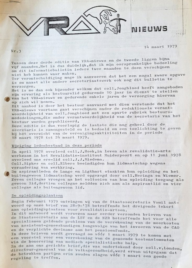 Na een jaar, dus in 1979, werd het blad omgedoopt tot de door Hans Jongbloed bedachte naam ‘Revalidata’. Niet veel later nam Hans de hoofdredactie over van Wim Peek. Het tijdschrift werd indertijd 4x per jaar uitgegeven. Het blad had een zeer simpele lay-out en vrijwel geen afbeeldingen. Inhoudelijke artikelen kwamen in de eerste jaargangen van Revalidata nauwelijks voor, het tijdschrift had toen meer het karakter van de huidige VRA-nieuwsbrief.