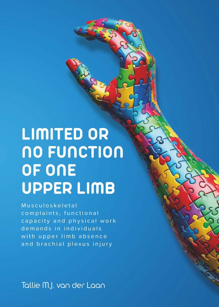 Mensen met beperkte of geen functie van een arm veroorzaakt door een afwezigheid van (een deel van) de arm (upper limb absence, ULA) of door plexus brachialis letsel (brachial plexus injury, BPI), hebben mogelijk een verhoogd risico op het ontwikkelen van musculoskeletale klachten (musculoskeletal complaints, MSCs). Zij moeten compenseren voor de beperkte functie van de aangedane arm. Door het gebruik van compensatoire bewegingen of het extra belasten van niet aangedane lichaamsdelen worden zij mogelijk extra blootgesteld aan bekende risicofactoren voor MSCs. Eerder promotieonderzoek toont dat de prevalentie van MSCs bij mensen met ULA bijna twee keer hoger is dan in de algehele populatie, en dat MSCs extra lichamelijke beperkingen veroorzaken bovenop de beperkingen door ULA.1 De prevalentie van MSCs en de gevolgen daarvan bij mensen met BPI zijn onbekend.