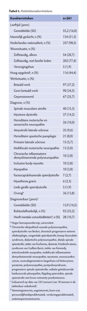 De 261 mensen die meededen aan het onderzoek hadden een gemiddelde leeftijd van 55,2 (SD=16,0) jaar en rapporteerden 40 verschillende NMA (tabel 1). Meest gerapporteerd werden spinale musculaire atrofie en myotone dystrofie. Circa 35% van de deelnemers was rolstoelafhankelijk (binnen- en buitenshuis). 11% gaf aan in de afgelopen 12 maanden een psychische aandoening te hebben gehad waarvoor men onder behandeling of controle was bij een huisarts, psycholoog, psychotherapeut of psychiater. Een stemmingsstoornis werd het meest genoemd. In tabel 2 zijn de scores op de verschillende uitkomstmaten weergegeven. Met een gemiddelde score van 16,6 (SD=4,8) op de subschaal acceptatie van de ICQ, lieten de deelnemers een matige tot redelijk hoge mate van ziekteacceptatie zien, hoewel er grote individuele verschillen waren, met scores variërend van 6 tot 24.