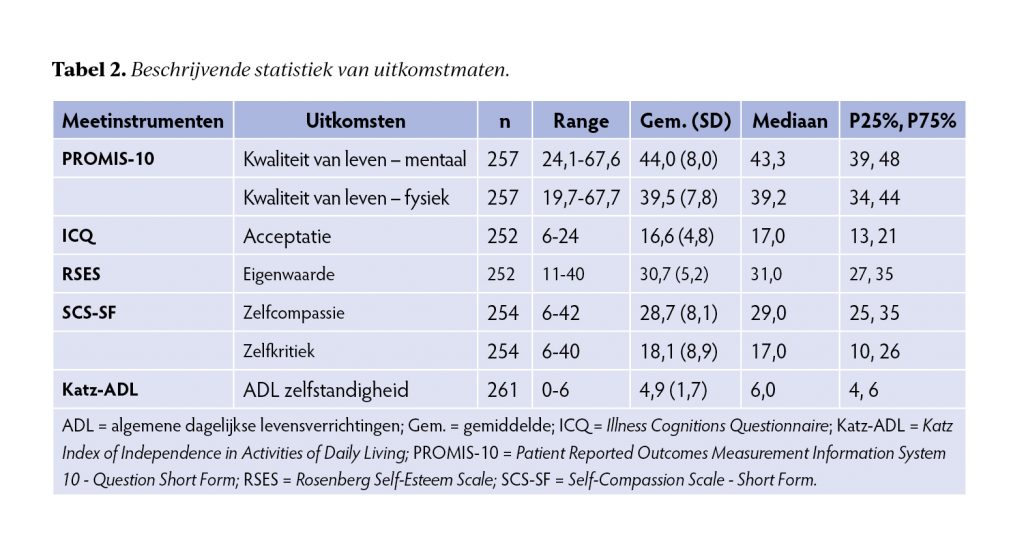 Covariaten. De mate van zelfstandigheid in het uitvoeren van dagelijkse activiteiten, zoals wassen en aankleden, werd uitgevraagd via de Katz Index of Independence in Activities of Daily Living (Katz-ADL, zes items, score 0-6).12 Hogere scores wijzen op een hogere mate van ADL-zelfstandigheid. Naast ziekteacceptatie zijn verschillende andere psychologische factoren uitgevraagd die in eerder onderzoek een samenhang lieten zien met kwaliteit van leven, waaronder zelfcompassie (vriendelijk/mild zijn voor zichzelf bij stress/tegenslag), zelfkritiek (kritisch/streng zijn voor zichzelf bij stress/tegenslag) en eigenwaarde.13,14 Zelfcompassie en zelfkritiek werden gemeten met de Self-Compassion Scale – Short Form (SCS-SF). Beide subschalen bestaan uit zes items met scores variërend van 6 tot 42, waarbij hogere scores duiden op een hogere mate van zelfcompassie dan wel zelfkritiek.13 Eigenwaarde werd beoordeeld aan de hand van de Rosenberg Self-Esteem Scale (RSES, 10 items, score 10-40).15 Hogere scores reflecteren een hogere mate van eigenwaarde.