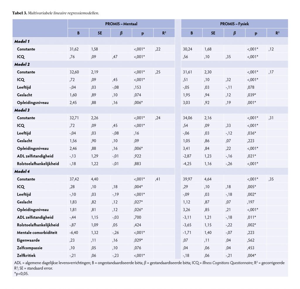 Om zicht te krijgen op de samenhang van ziekteacceptatie met zowel mentale als fysieke kwaliteit van leven werden multivariabele lineaire regressieanalyses uitgevoerd. Er werd voldaan aan alle assumpties om deze analyses uit te voeren. De analyse werd uitgevoerd in vier stappen. In het eerste model werd uitsluitend de samenhang tussen ziekteacceptatie en mentale of fysieke kwaliteit van leven geanalyseerd. In de tweede stap werd het model uitgebreid met een aantal socio-demografische kenmerken (leeftijd, geslacht en opleidingsniveau) en in het derde model werden functionele beperkingen (ADL en rolstoelafhankelijkheid) toegevoegd. Het vierde en meest uitgebreide model corrigeert ook voor meerdere psychologische factoren die samenhang kunnen vertonen met kwaliteit van leven, waaronder mentale comorbiditeit, zelfcompassie, zelfkritiek en eigenwaarde. De resultaten werden statistisch significant bevonden bij een p-waarde <0,05.