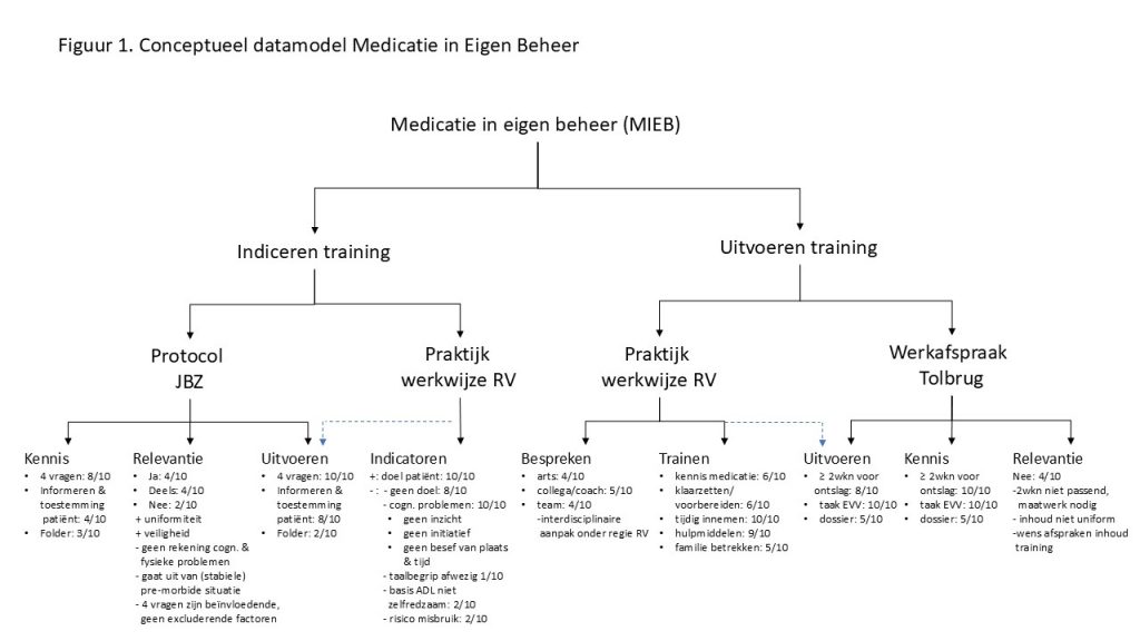 Tussen oktober 2023 en mei 2024 werd een kwalitatief onderzoek uitgevoerd onder RV van Tolbrug/Jeroen Bosch Ziekenhuis (JBZ) gericht op de indicatiestelling MIEB. RV die bevoegd waren medicatie te verstrekken en langer dan één jaar tenminste 20 uur per week werkten, werden benaderd. Vierentwintig van de dertig benaderde RV waren bevoegd voor het verstrekken van medicatie. Zeventien RV gaven toestemming en tien werden via loting geïncludeerd. Na informed consent, volgden semigestructureerde interviews met thema’s als geprotocolleerd werken, indicatiestelling MIEB, training MIEB, en werkafspraken, zie tabel 1. Voor analyse vond peer-debriefing en membercheck plaats. Demografische gegevens zijn te vinden in tabel 2. Voor het conceptueel data model zie figuur 1.
