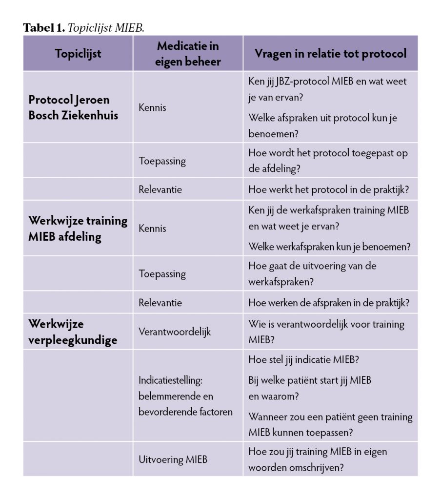 De patiënt leren omgaan met zijn eigen medicatie (medicatie-zelfmanagement) is een belangrijk onderdeel van het dagelijks werk van revalidatieverpleegkundigen (RV).1 Training medicatie in eigen beheer (MIEB) is daar onderdeel van. Patiënten oefenen in een veilige omgeving met het zelfstandig beheren van eigen medicatie om dit daarna veilig thuis te kunnen voortzetten.2 We weten dat leren omgaan met eigen medicatie specifieke competenties vraagt van zowel patiënt als RV.1Minder duidelijk is hoe RV bepalen of een patiënt kan starten met MIEB. Daarom hebben we vervolgonderzoek gedaan naar de manier waarop RV start MIEB bepalen.
