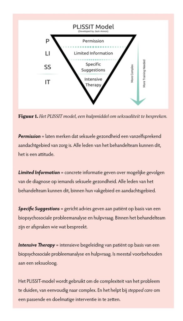 Het PLISSIT-model verankert structurele en proactieve multidisciplinaire aandacht voor seksuele gezondheid. Je kunt het gebruiken als organiserend model in je team of instelling (wie doet wat wanneer), maar ook als gefaseerd gespreksmodel (wanneer doe ik wat). Het wordt in een aantal richtlijnen geadviseerd.3