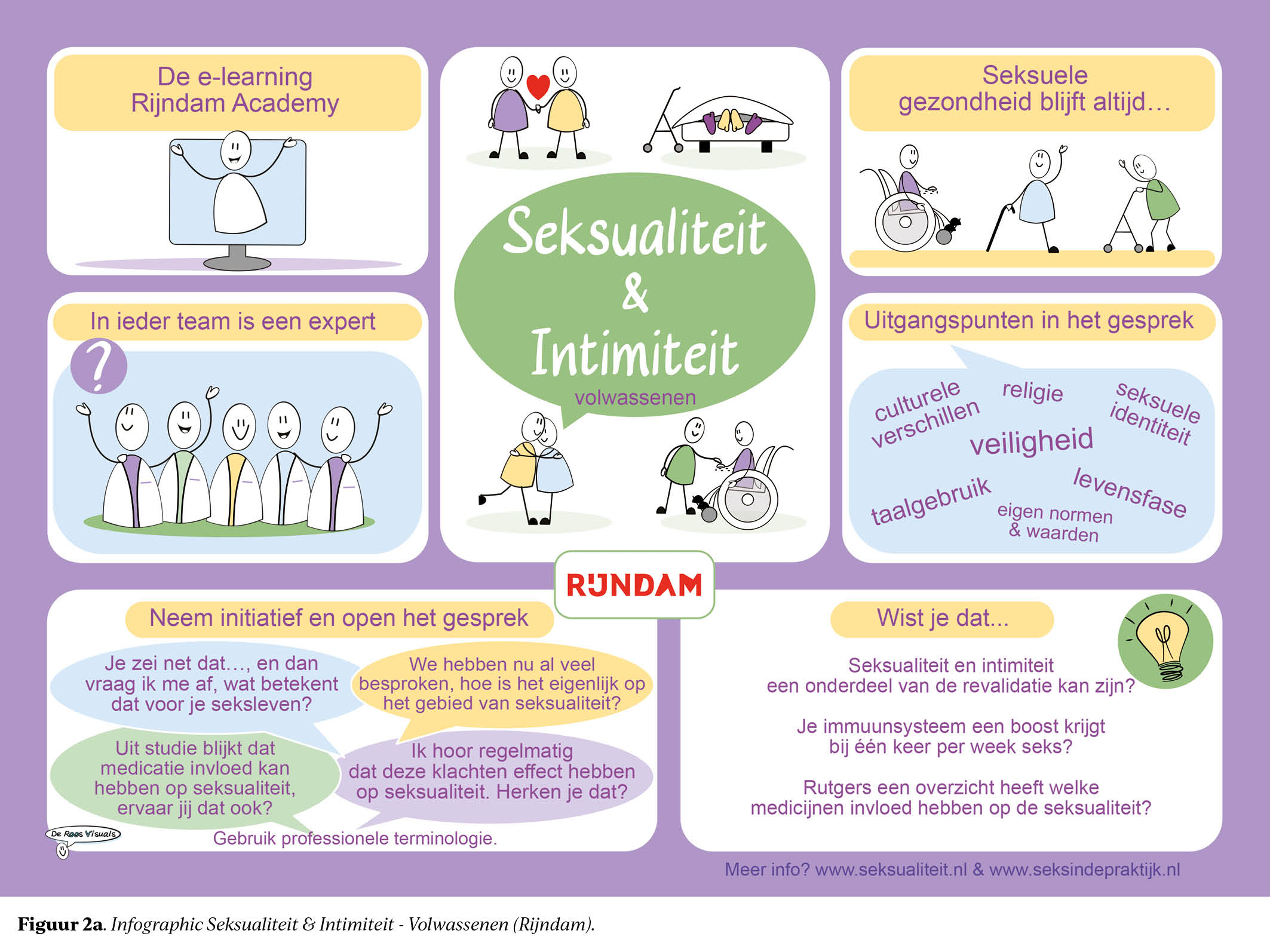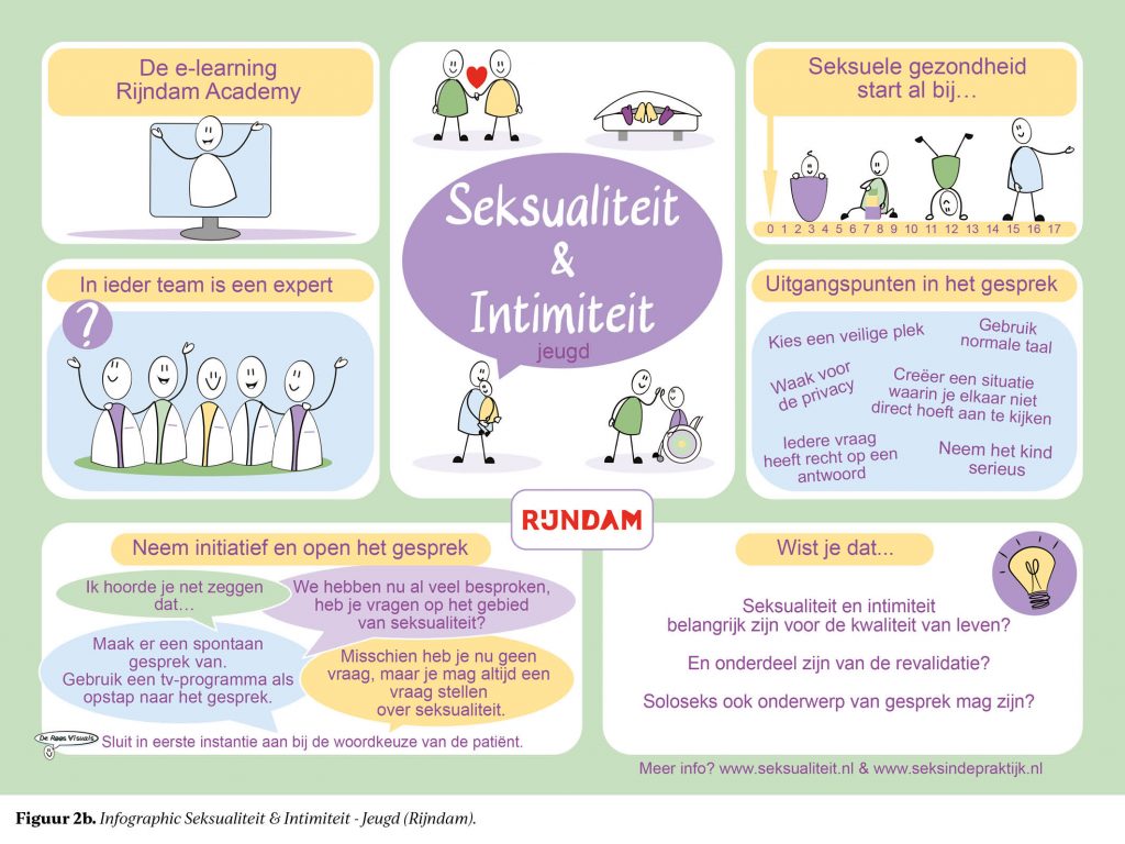 Bij vragen op het gebied van seksuele gezondheid kan er verwezen worden naar intimiteitsverpleegkundigen of andere collega’s waaronder maatschappelijk werkers en fysiotherapeuten met expertise op dit gebied. Zij hebben deze kennis opgedaan door onder andere de post-HBO-opleiding seksuologie bij de RINO groep.7 Indien er meer specialistische zorg noodzakelijk is wordt er door de revalidatiearts verwezen naar een seksuoloog buiten Rijndam.