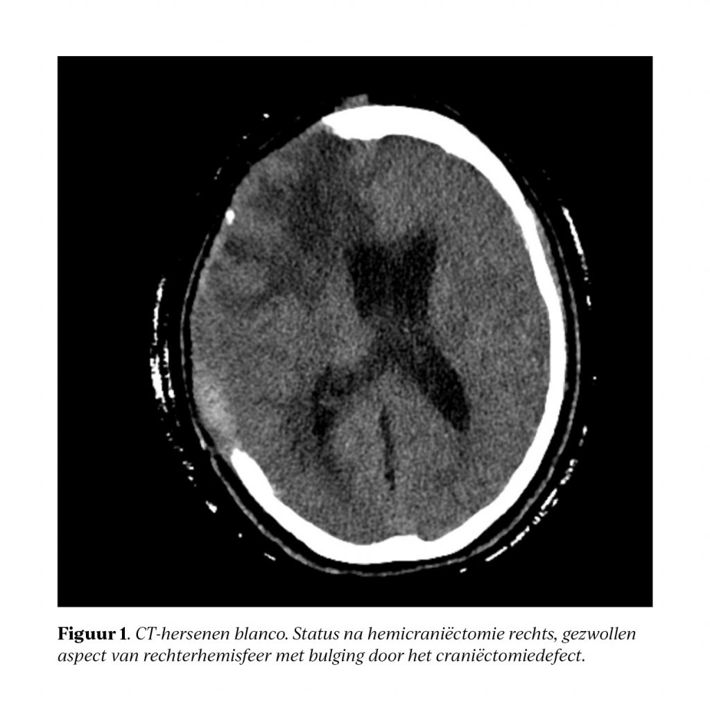 In de kliniek zagen wij een 47-jarige vrouw zonder relevante voorgeschiedenis, die na een auto-ongeluk ernstig schedel- en hersenletsel opliep. Zij onderging onder meer een decompressieve craniëctomie rechts en werd na een IC-opname van ruim een maand overgeplaatst naar de verpleegafdeling van de Neurologie.