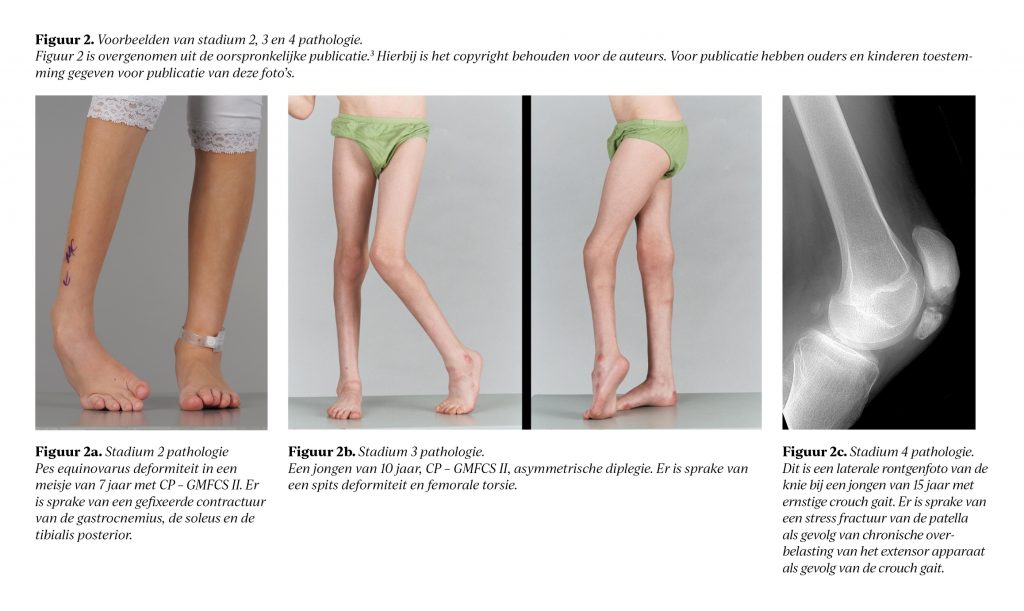 Het is belangrijk te benadrukken dat er zeker sprake kan zijn van overlap tussen de verschillende stadia, met name bij stadium 2 en 3. De meeste kinderen met (spastische) CP vertonen een combinatie van weke-delencontracturen en benige torsieproblemen, in combinatie met restverschijnselen van spasticiteit en spierzwakte. Een voorbeeld van stadium 2-3 pathologie is weergegeven in figuur 2a en 2b.